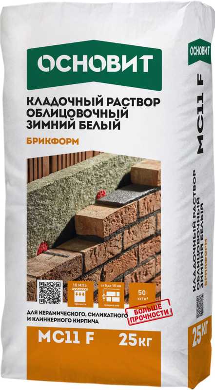 Кладочный раствор ОСНОВИТ БРИКФОРМ МС11 F зимний предназначен для кладки стен из облицовочного кирпича с водопоглощением до 12% с возможностью расшивки швов в момент укладки при температуре окружающей среды и основания от -10 до + 10°С.