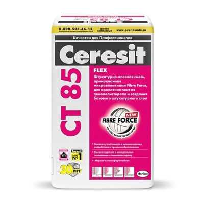 Штукатурно-клеевая смесь CT 85 предназначена для крепления на минеральных основаниях плит из пенополистирола и создания на них базового штукатурного слоя, армированного стеклосеткой, при устройстве систем фасадных теплоизоляционных композиционных (СФТК) с теплоизоляционным слоем из пенополистирольных плит (Ceresit EPS).